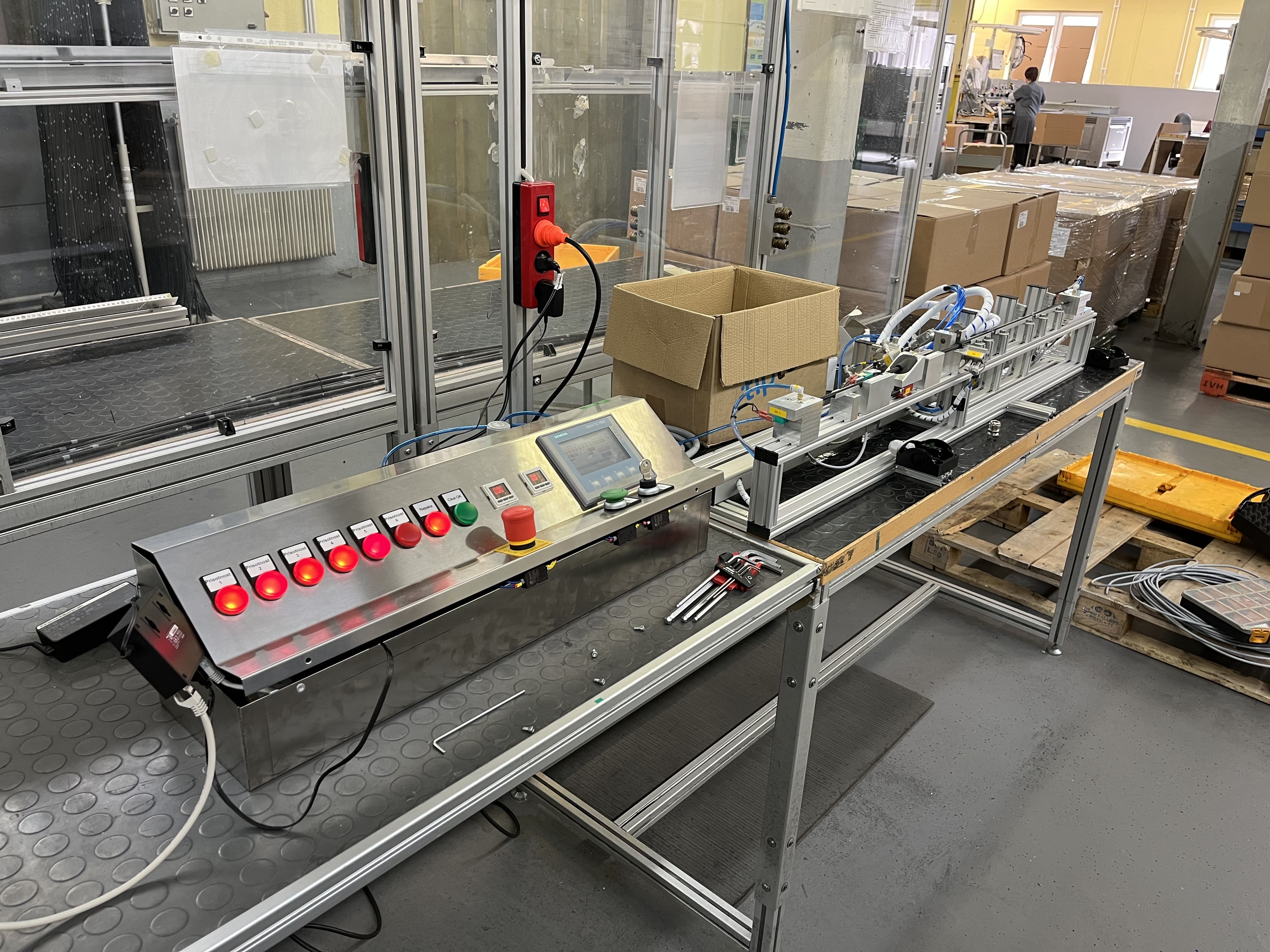 Works included complete 3D CAD design, parts purchasing, CNC machining and assembly. We used SIEMENS S7-1200 PLC and SIMATIC HMI panel for control. Purpose of device is to make repetative work easier and error free. Device is reporting specific problems on test subjects, such as missing labels, or failed pressurization tests.