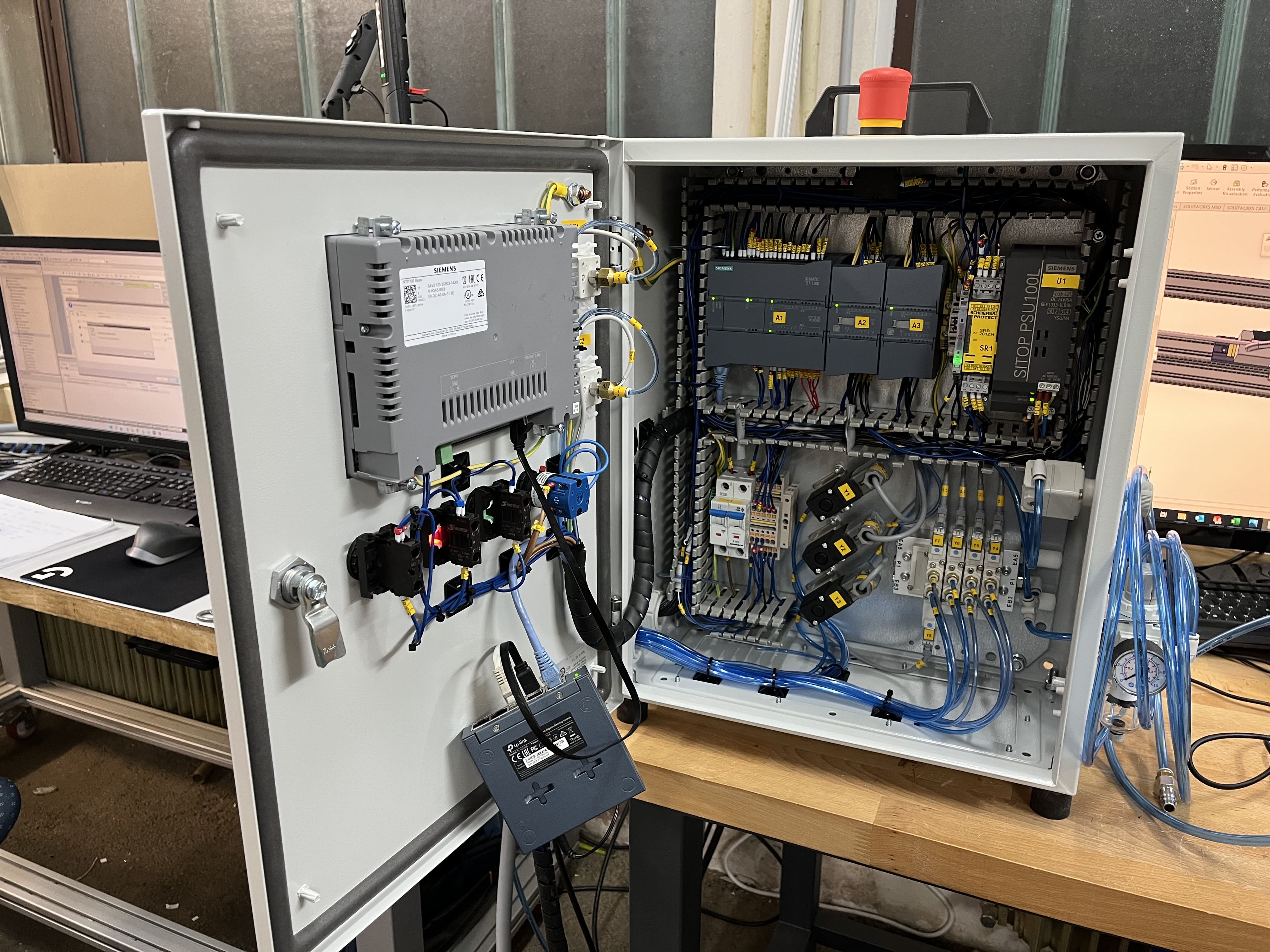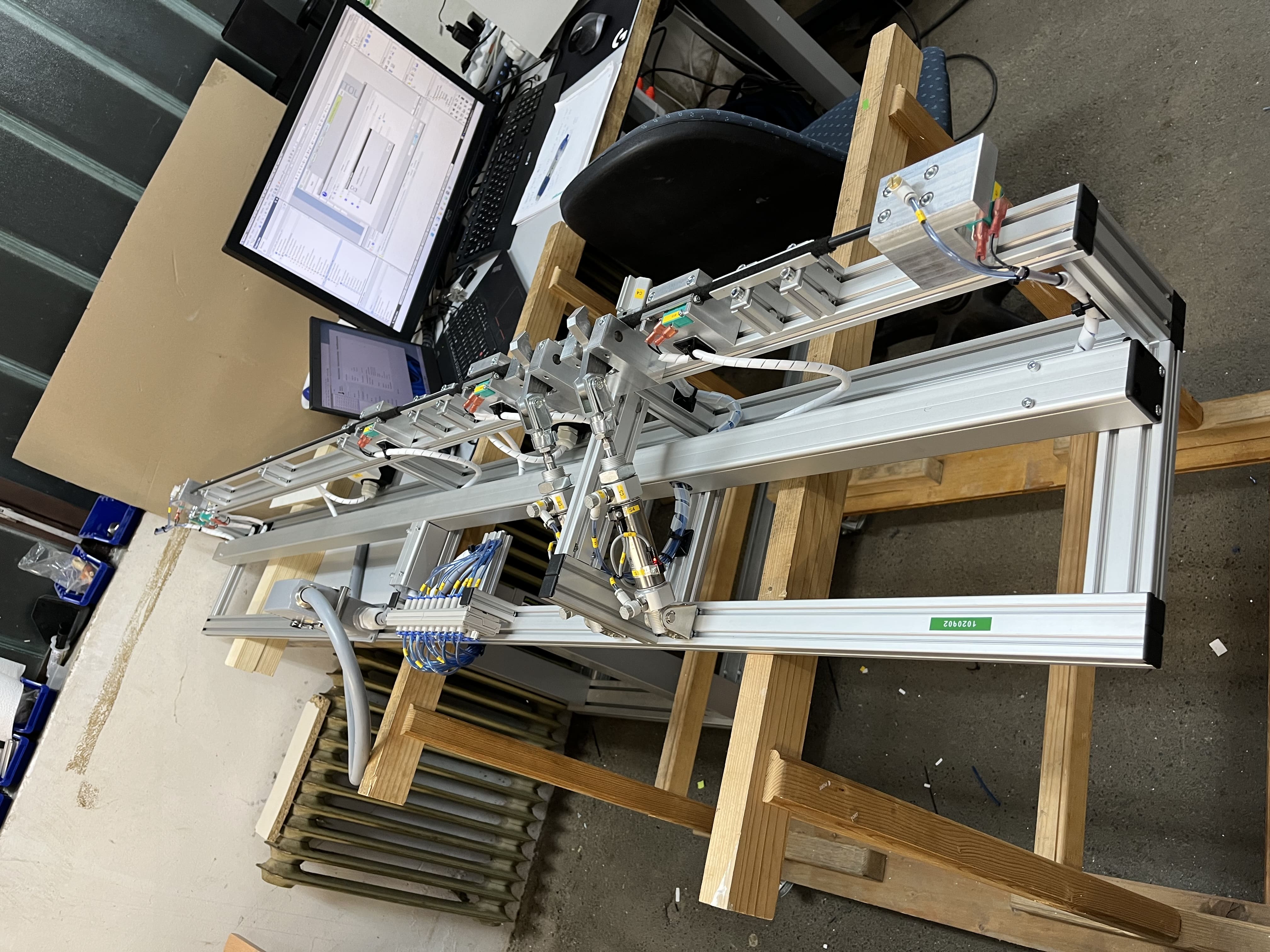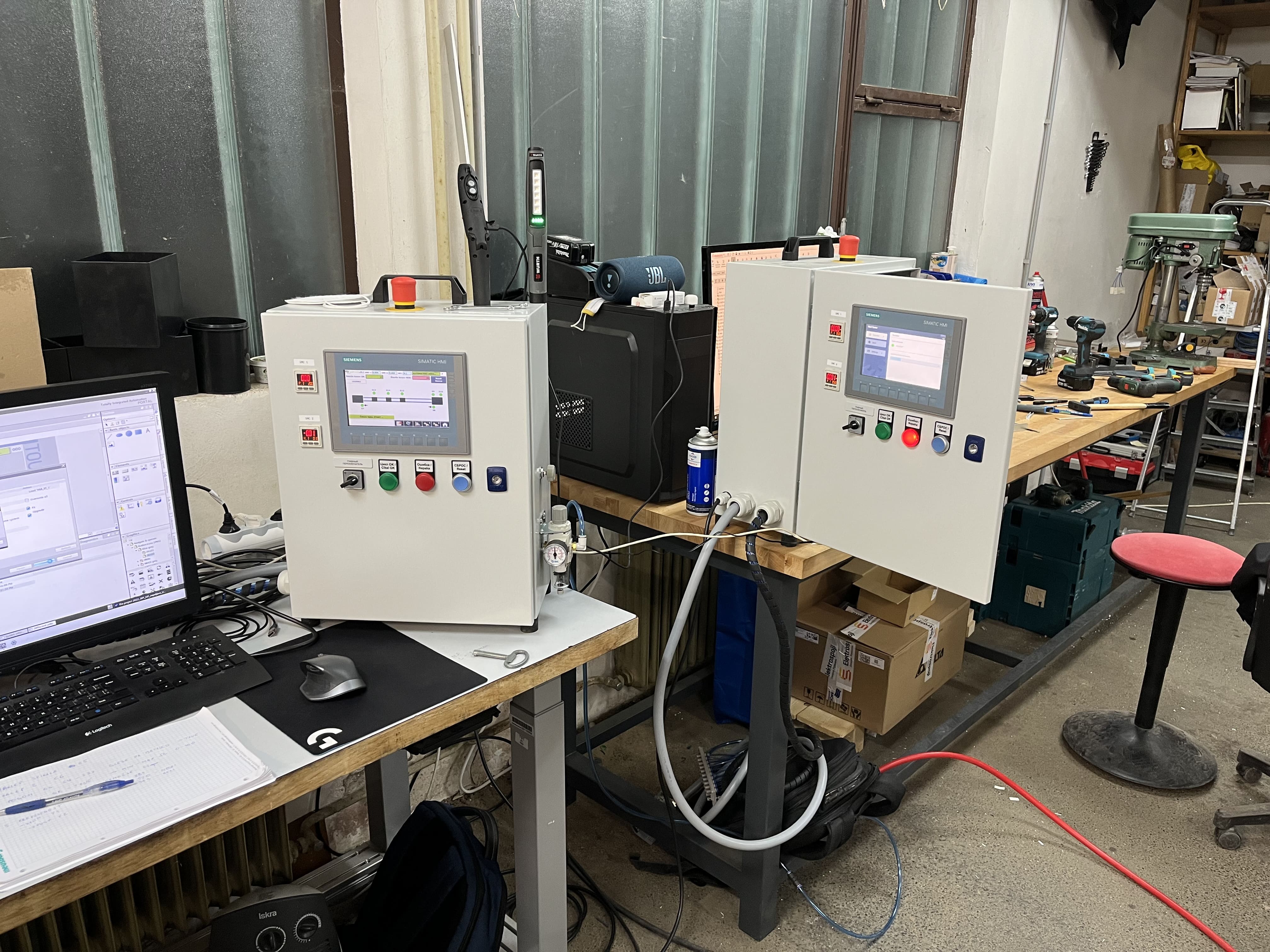 Works included complete 3D CAD design, parts purchasing, CNC machining and assembly. We used SIEMENS S7-1200 PLCs and SIMATIC HMI panels for control. Purpose of devices is to make repetative work easier and error free. Devices are reporting specific problems on test subjects, such as missing labels, or failed pressurization tests.