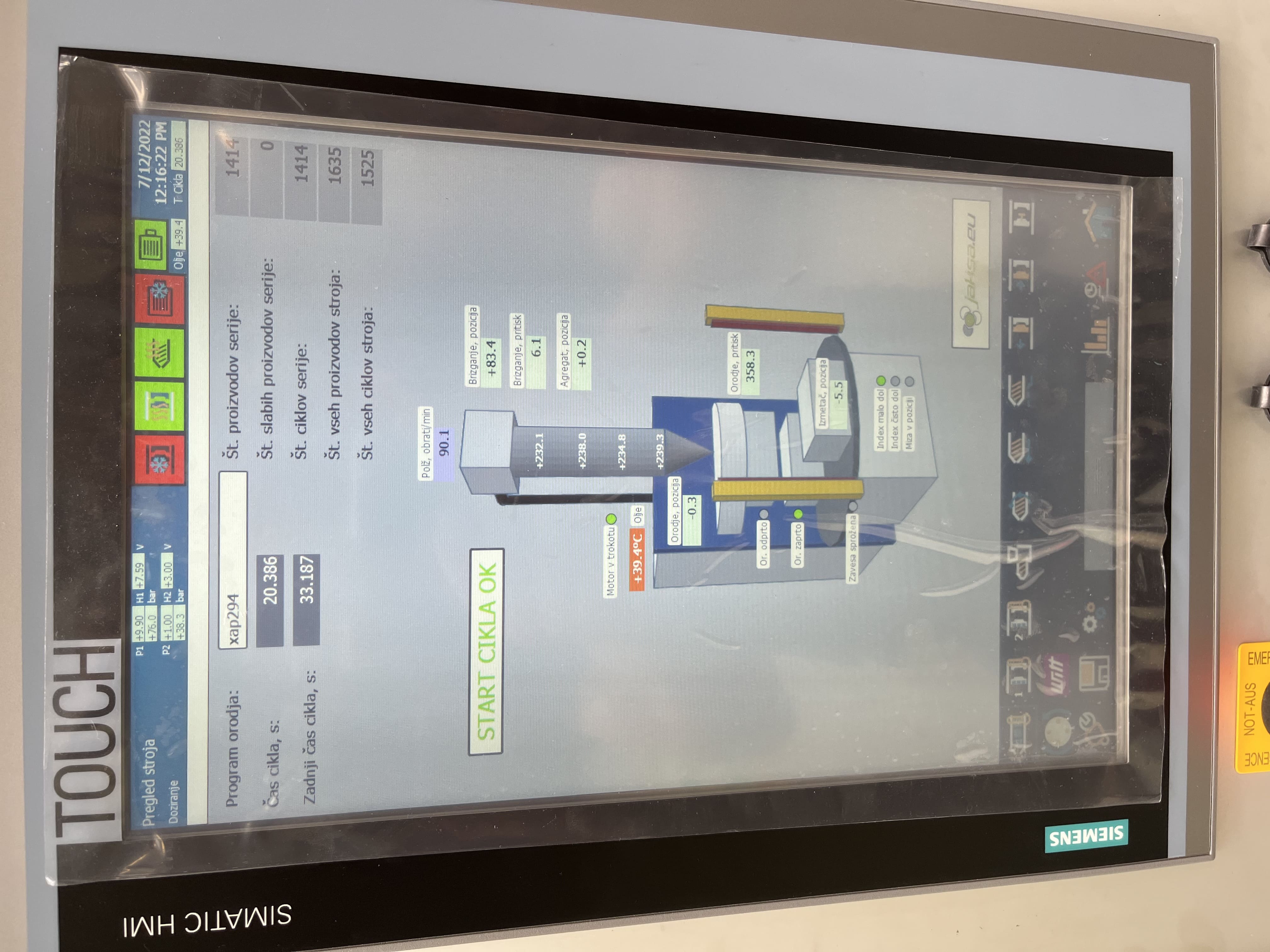 Works included complete removal of old computer control and software and installation of new modern SIEMENS control system and software including new touch screen HMI, hydraulics upgrade, mouting of new sensors for hydraulic pressure, installation of new PROFINET absolute encoder for table rotation position measurement, installation of new hot runner for mould temperature regulation and rework of electrical wires in the main electrical cabinet. As an addition we integrated Wittmann water temperature regulators into the system via the serial RS485 protocol.